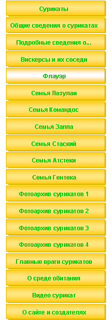 О Флауэр Флауэр самая знаменитая суриката в мире. Она была самой лучшей в семье Вискерсов и поэтому стала главой семьи. Она умерла когда ей было только 6 лет. |