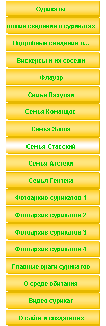 Семья Стасский. Трагическая история связана с этой семьёй. Она не прожила и года. Сначала умер от раны в голове главный самец Карлос. Затем еще три суриката. Следующей стала сестра главной самки. Затем на прицеле смерти стала главная самка Кинкаджу. Она умерла от голода. И последней умерла Моцарт, от зубов шакала. |